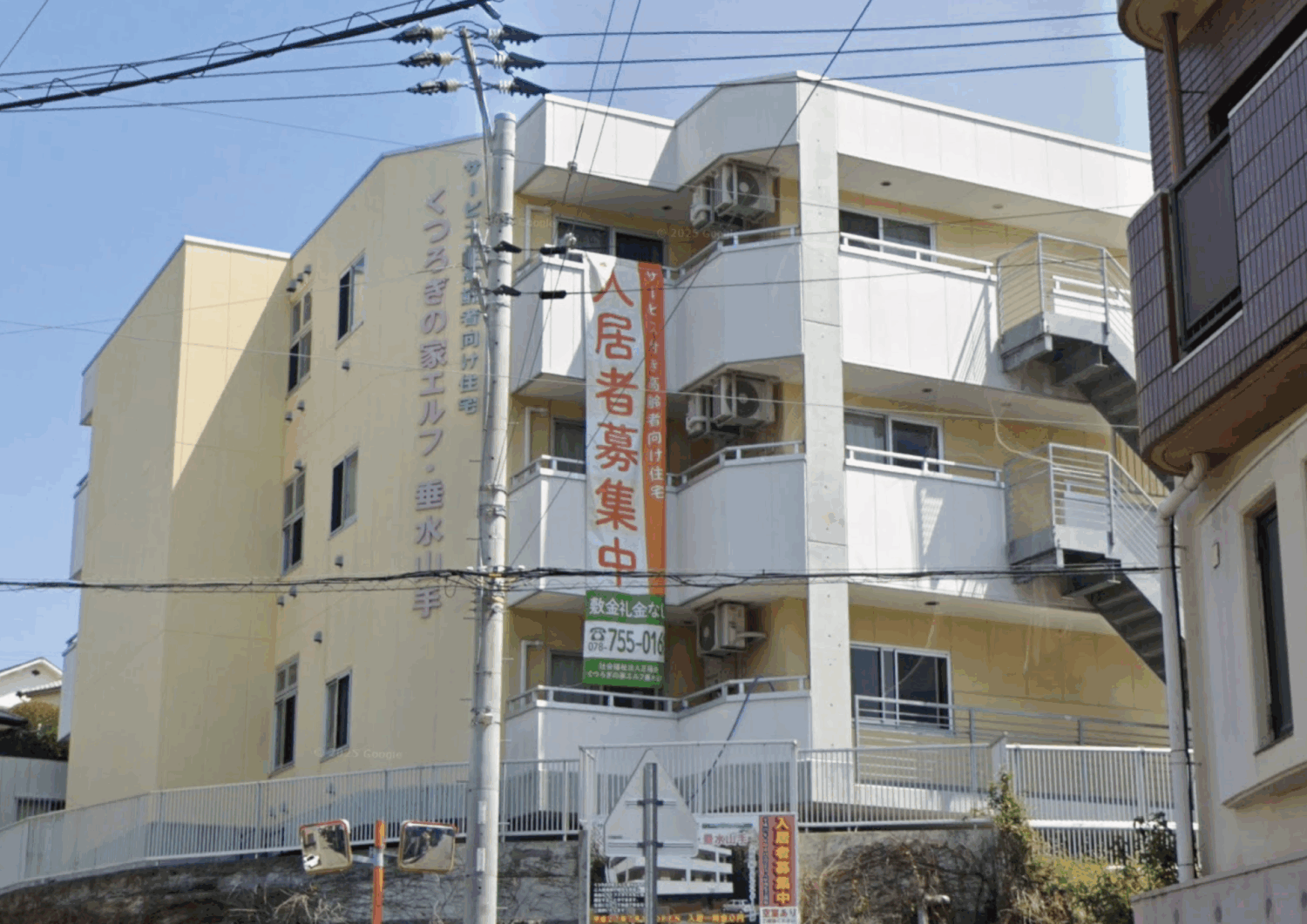 サービス付き高齢者向け住宅「くつろぎの家エルフ・垂水山手」の施設外壁に掲出する懸垂幕をデザイン・印刷代行をいたしました。サイズは125㎝×580㎝で、長辺が5メートルを超える大型幕です。3階建ての建物の外壁色に合い、近隣住宅地の中でうるさすぎない配色、かつ遠方からも視認できるデザインといたしました。掲出面は日陰になる時間帯が多いため、そのことも配慮し、白や明るい色を採用しました。また垂れ幕素材は屋外で耐久性のあるターポリンで、上下に棒を入れる袋、上部3か所にはロープを通すハトメを設置しました。